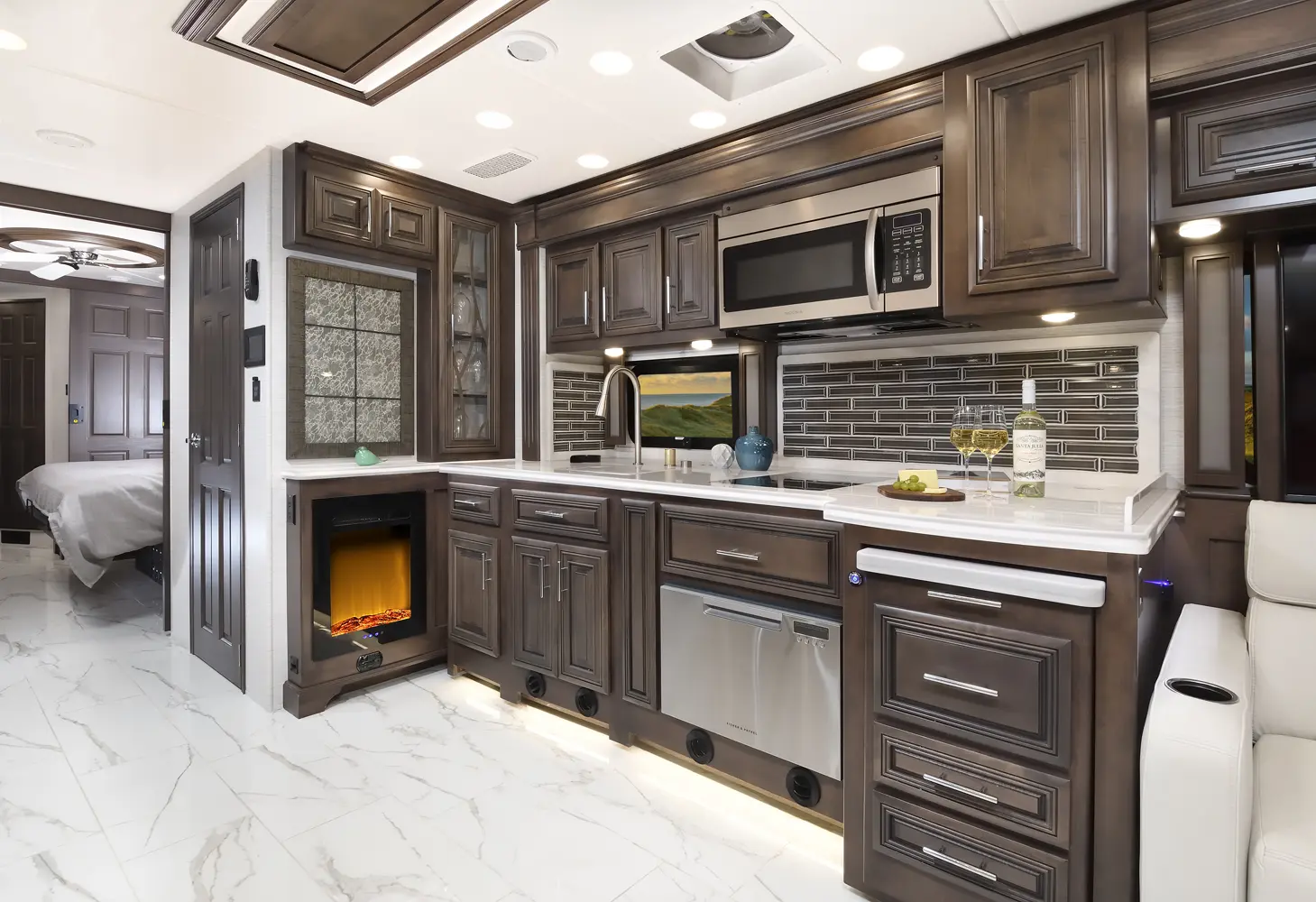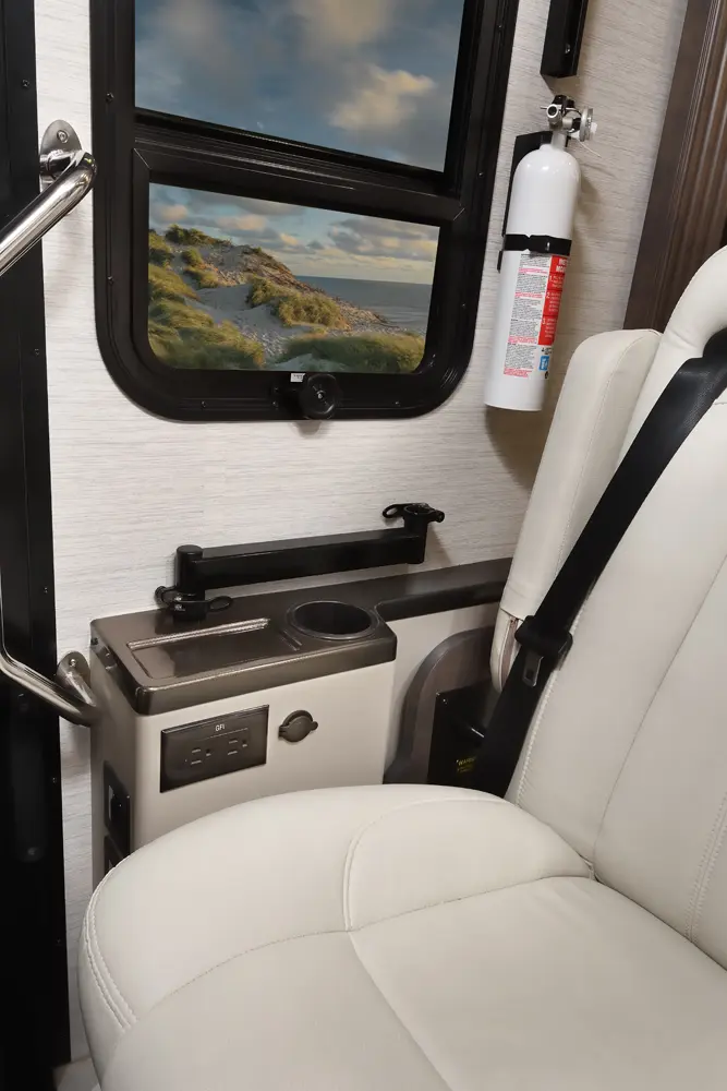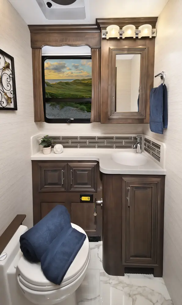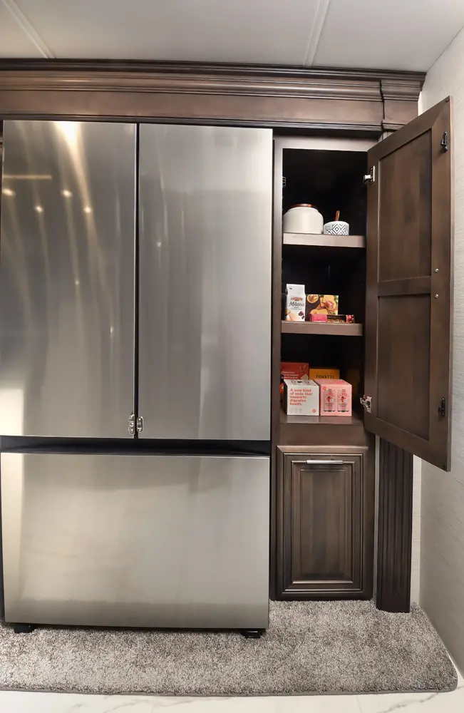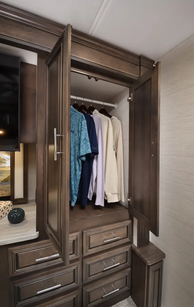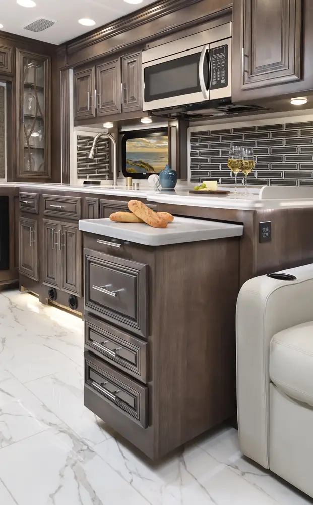 The Berkshire XLT 45E is a five-slide bunkhouse model. The large full rear bath includes a shower, vanity, cabinets, and stacking washer/dryer. Within the bathroom is a slideout bunk room/wardrobe combo. Each bunk is 30" x 73" and has its own TV. The main bedroom has a slideout, 72" x 80" Tilt-a-View king bed, plus a dresser, wardrobe cabinet, 43" TV, and overhead cupboards. Moving toward the living area is a half bath with vanity sink, medicine cabinet, and commode. The kitchen is fully equipped with a convection microwave, induction cooktop, and residential-style refrigerator. Just over the cockpit, you'll find a unique drop-down bed that provides an additional sleeping surface.
