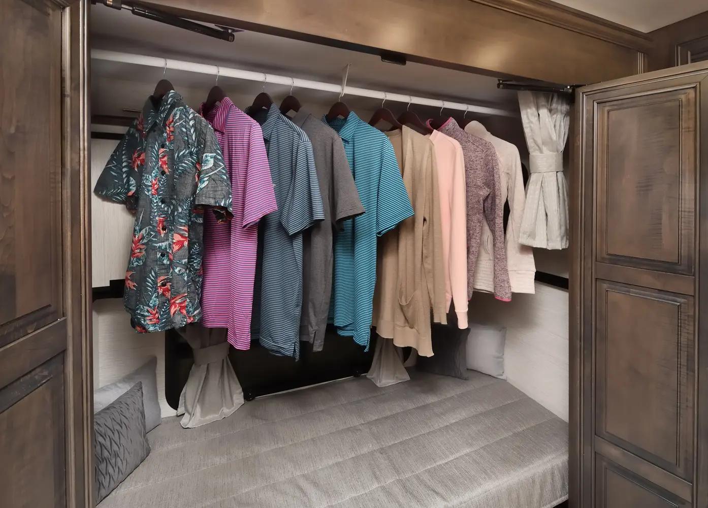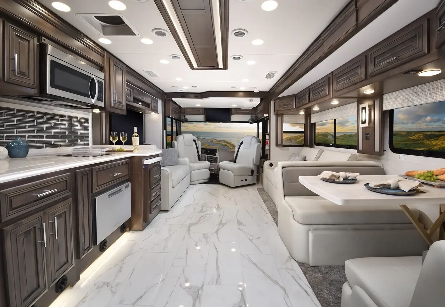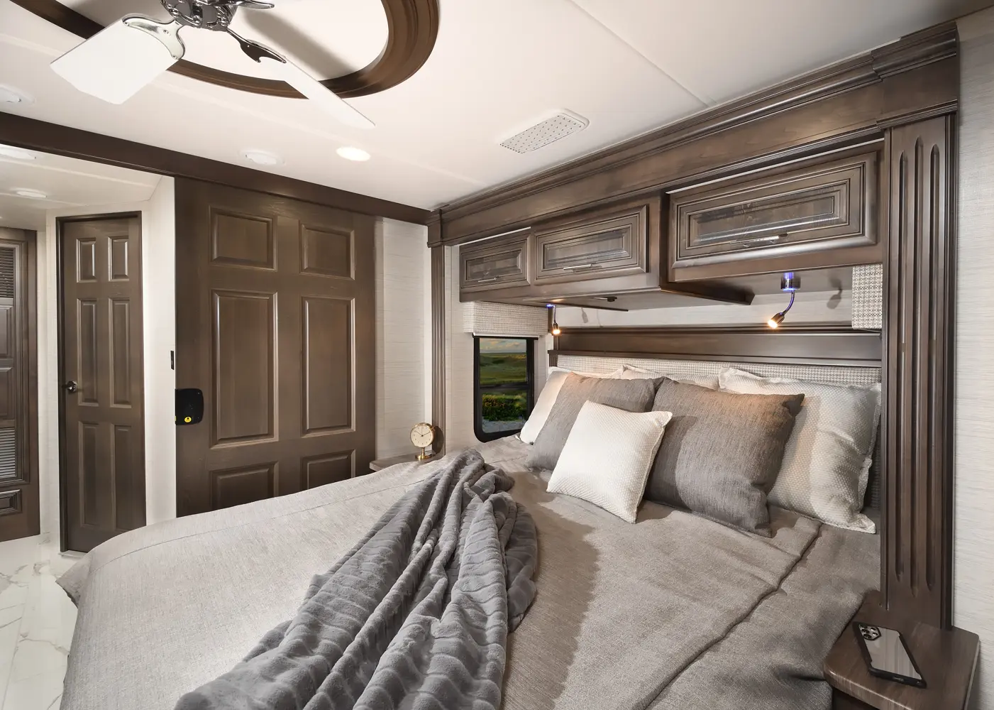 The Berkshire XLT 45E is a five-slide bunkhouse model. The large full rear bath includes a shower, vanity, cabinets, and stacking washer/dryer. Within the bathroom is a slideout bunk room/wardrobe combo. Each bunk is 30" x 73" and has its own TV. The main bedroom has a slideout, 72" x 80" Tilt-a-View king bed, plus a dresser, wardrobe cabinet, 43" TV, and overhead cupboards. Moving toward the living area is a half bath with vanity sink, medicine cabinet, and commode. The kitchen is fully equipped with a convection microwave, induction cooktop, and residential-style refrigerator. Just over the cockpit, you'll find a unique drop-down bed that provides an additional sleeping surface.