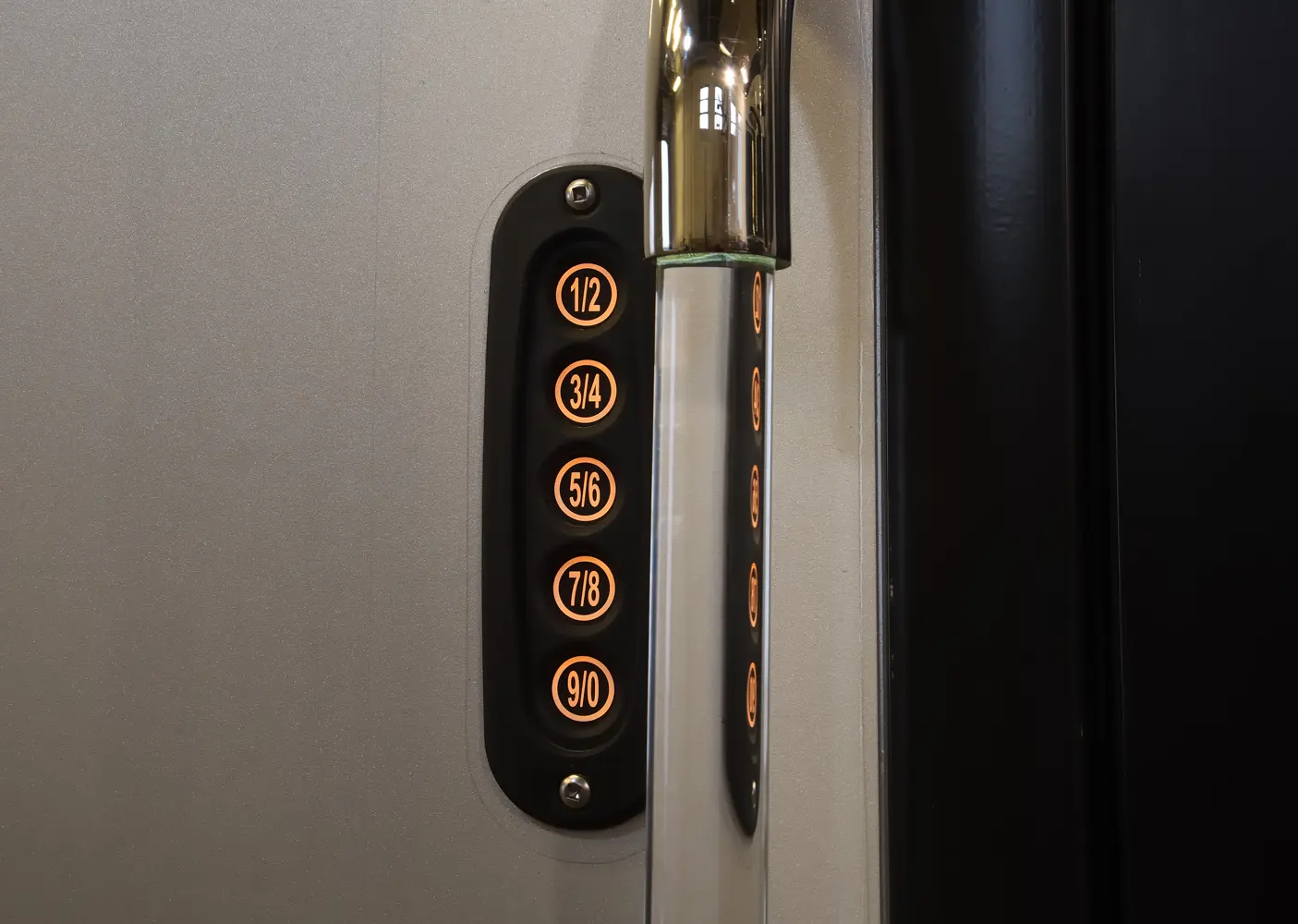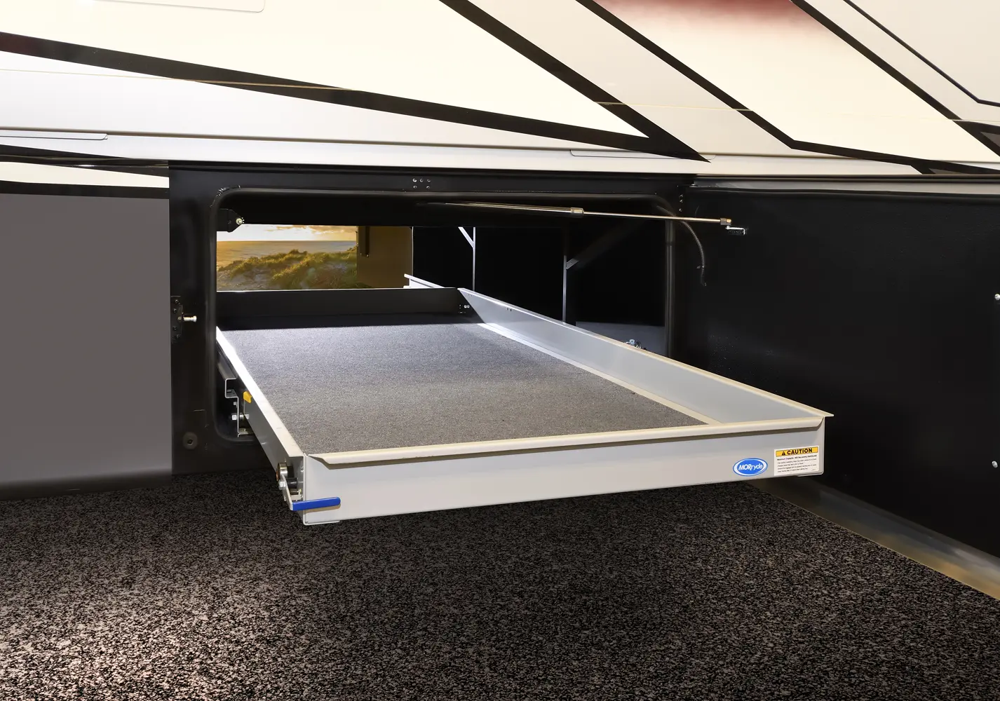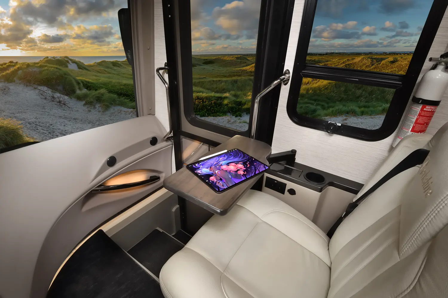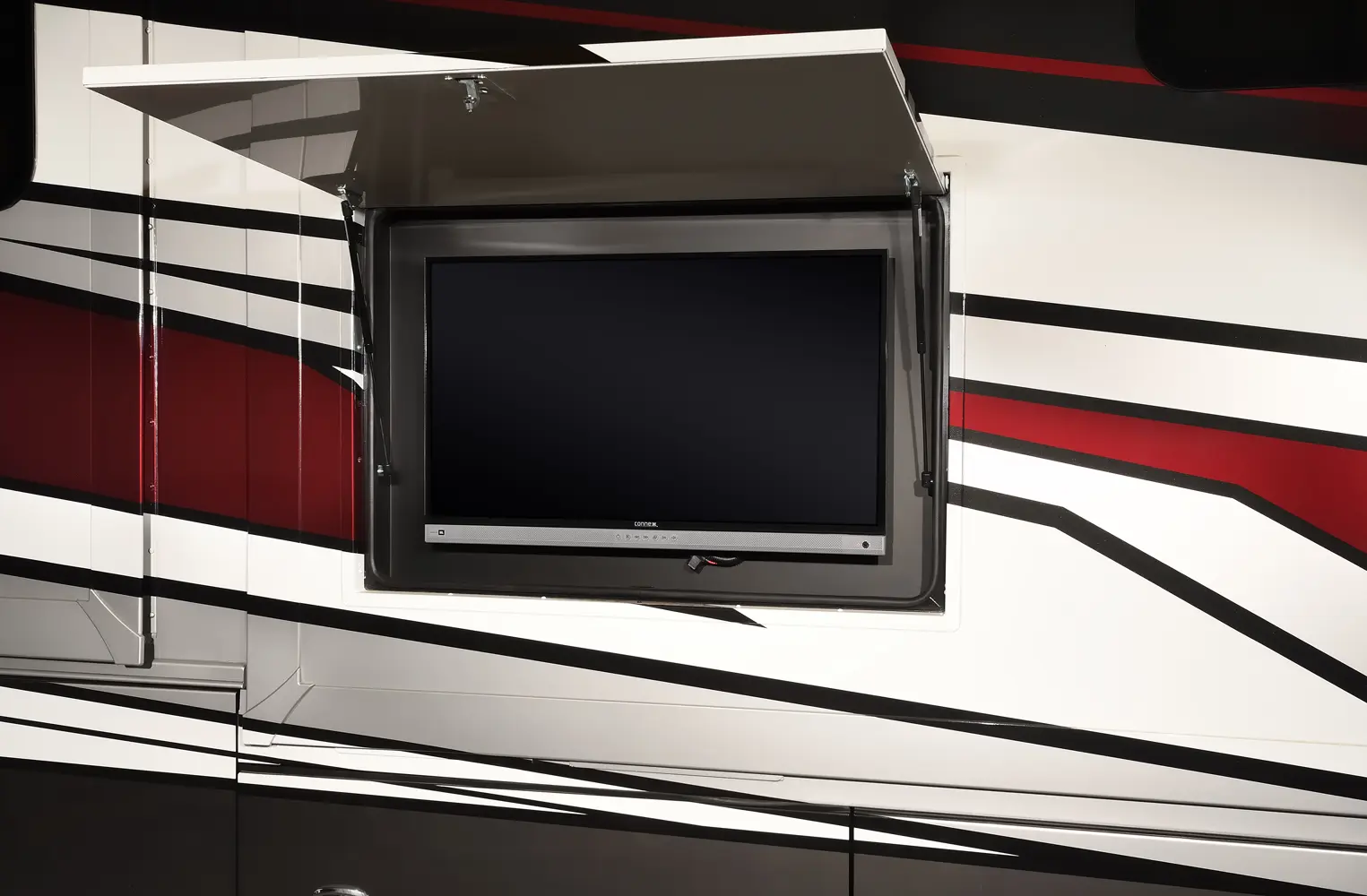 The Berkshire XLT 45E is a five-slide bunkhouse model. The large full rear bath includes a shower, vanity, cabinets, and stacking washer/dryer. Within the bathroom is a slideout bunk room/wardrobe combo. Each bunk is 30" x 73" and has its own TV. The main bedroom has a slideout, 72" x 80" Tilt-a-View king bed, plus a dresser, wardrobe cabinet, 43" TV, and overhead cupboards. Moving toward the living area is a half bath with vanity sink, medicine cabinet, and commode. The kitchen is fully equipped with a convection microwave, induction cooktop, and residential-style refrigerator. Just over the cockpit, you'll find a unique drop-down bed that provides an additional sleeping surface.