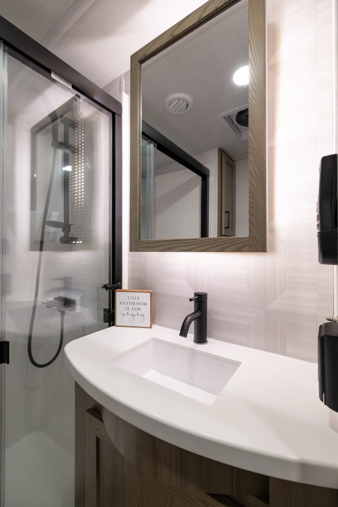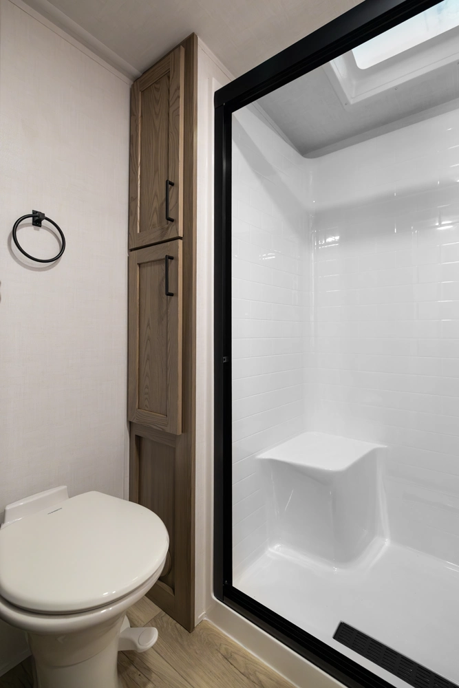 This elegant rear living unit offers a 76" hide-a-bed sofa, 60" theater seating, and a fireplace with TV for ultimate relaxation. The kitchen features an island, pantry, and ample counter space, while the dining area includes a table with chairs and bench seating. The front bedroom boasts a king bed, washer/dryer prep, dresser, and wardrobe storage. With dual awnings and pass-thru storage, it’s built for comfort and convenience.