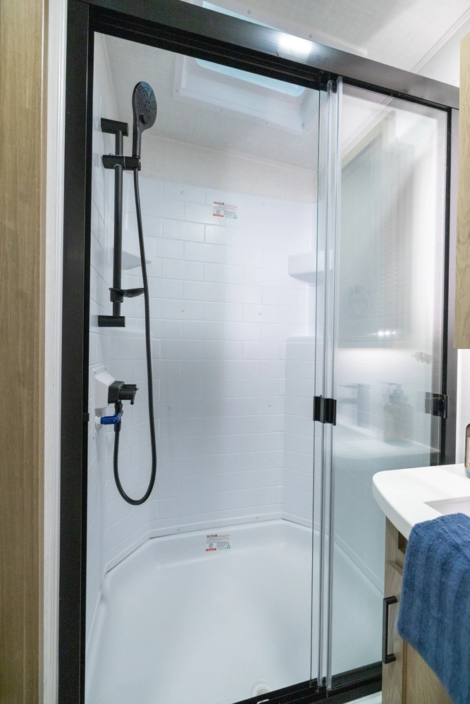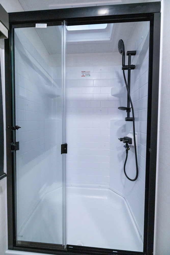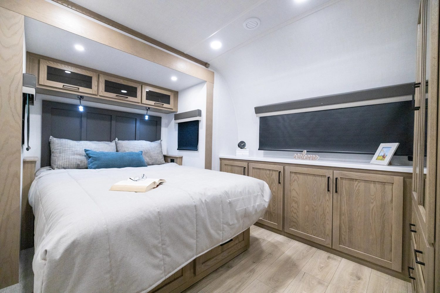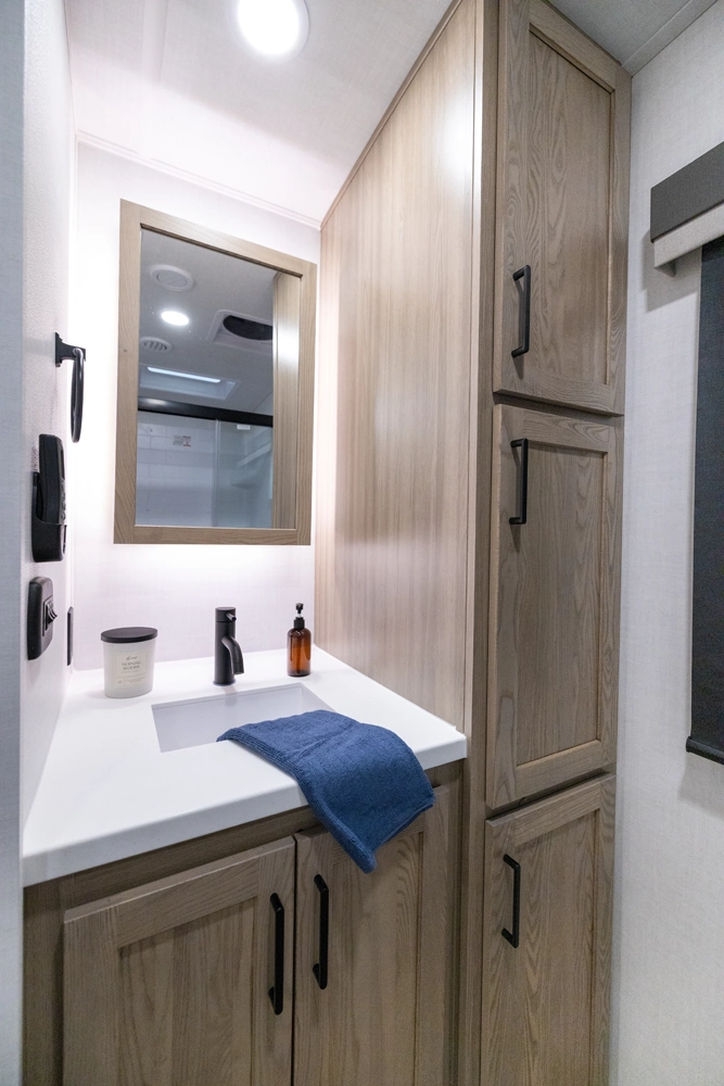 This spacious dual bedroom floorplan features a rear king suite with a full bath and a front queen bedroom with its own bath as well. Between them is a large open living area with a U-shaped dinette, theater seating, fireplace and well-equipped kitchen with an island. 4 slide outs widen the space, maximizing comfort and storage for families or couples.