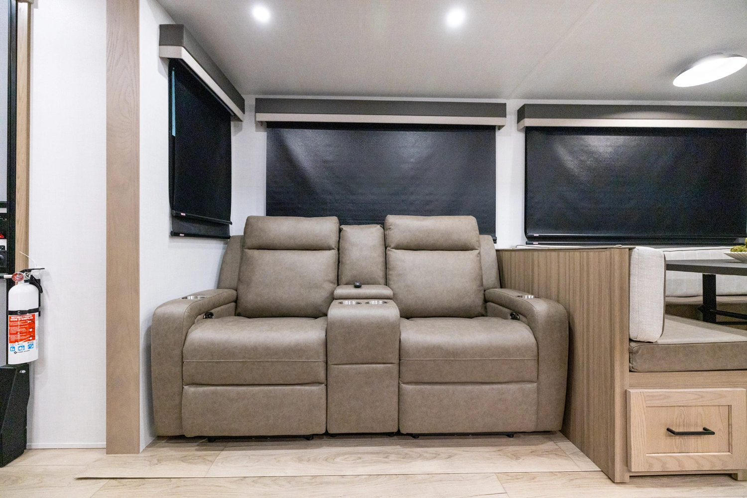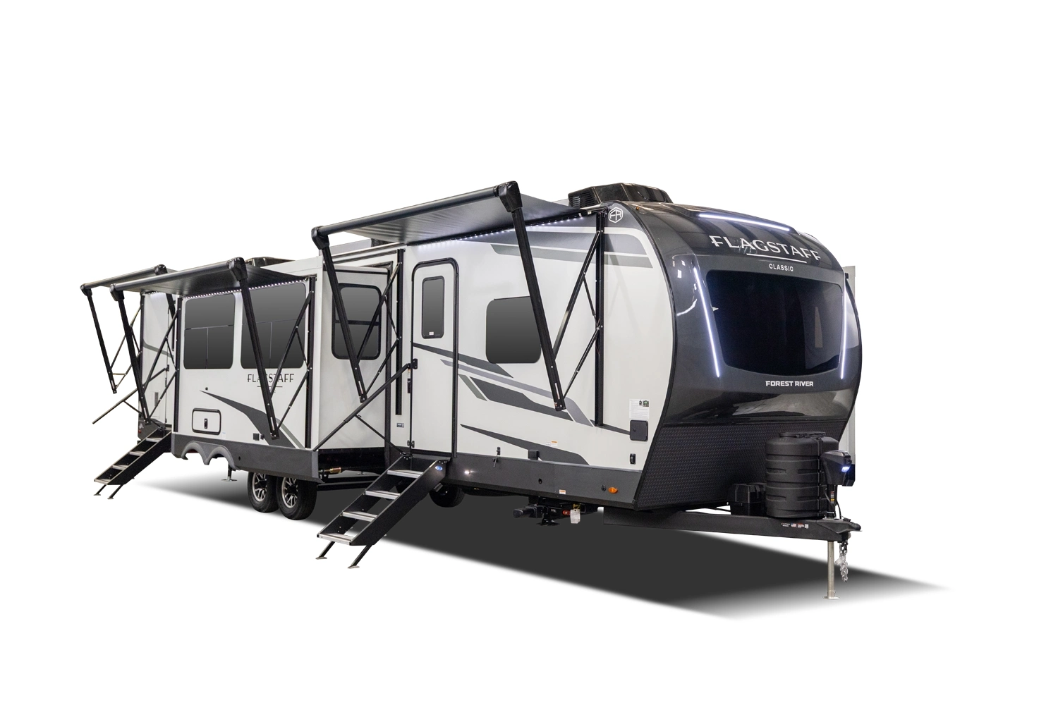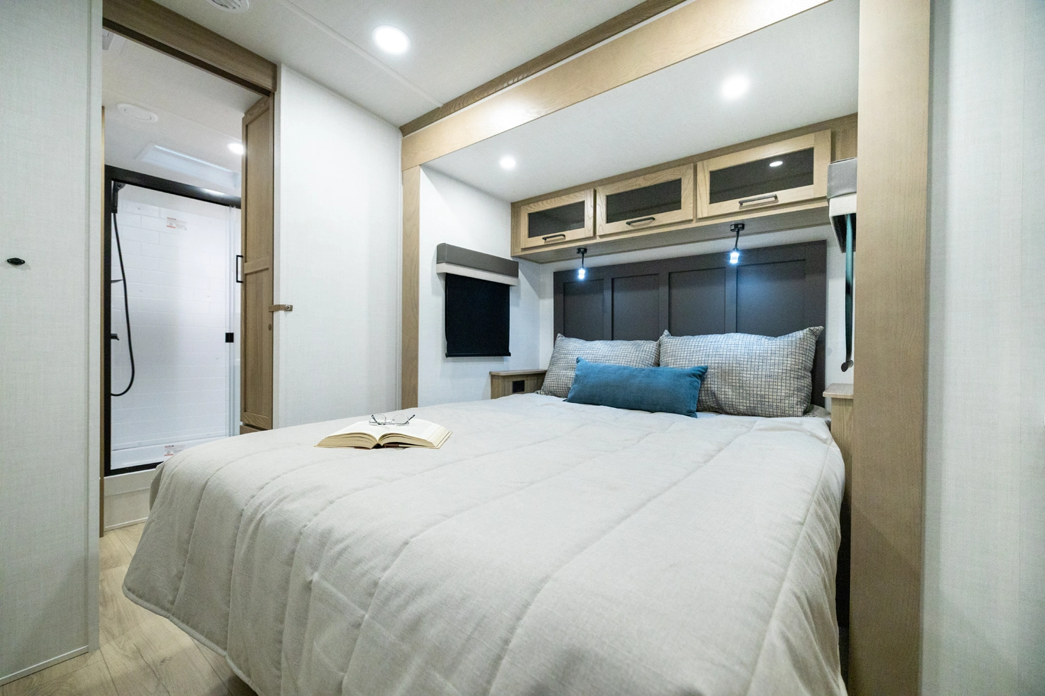 This spacious dual bedroom floorplan features a rear king suite with a full bath and a front queen bedroom with its own bath as well. Between them is a large open living area with a U-shaped dinette, theater seating, fireplace and well-equipped kitchen with an island. 4 slide outs widen the space, maximizing comfort and storage for families or couples.