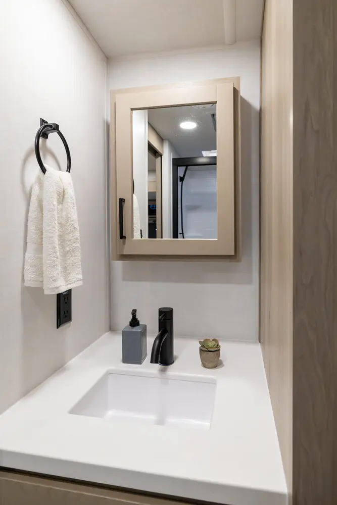 The front kitchen with a large window creates an open, inviting feel with great campsite views. Theater seating faces the entertainment center for easy viewing, with an optional hide-a-bed for guests. The bedroom includes a queen bed in a slide-out, dresser, and wardrobe with washer/dryer prep. A spacious bathroom with a large shower and linen storage adds comfort and convenience, making this coach feel like home.