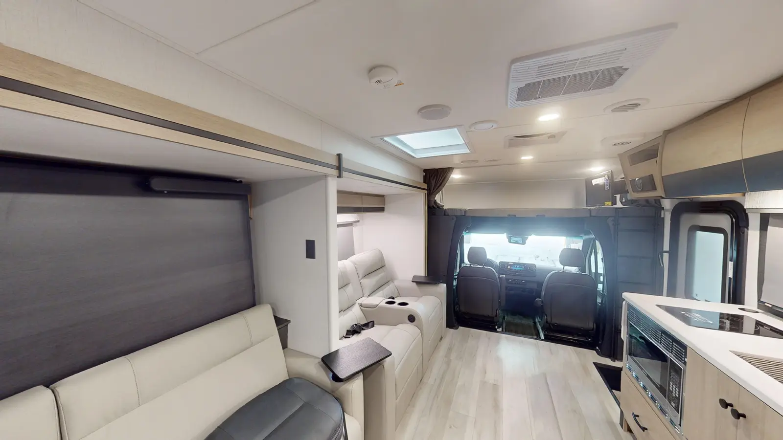 The Forester 2401T is a unique floorplan that features a Murphy bed for comfortable sleeping space at night, and a sofa with a removable table for daytime.The kitchen offers a 10.7 cu. ft. 12V refrigerator, a convection microwave, a recessed three-burner range, soft touch self-closing drawer guides and a cordless 12V charging plate, while the spacious rear bath includes a 24" x 36" skylight shower, commode, and vanity sink with a medicine cabinet.