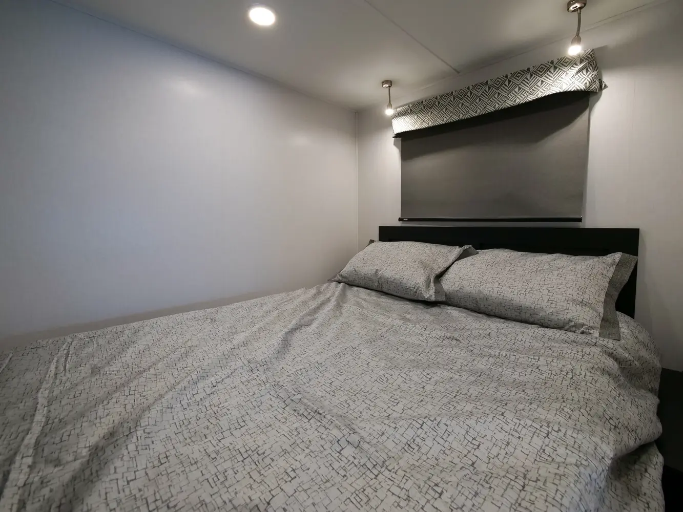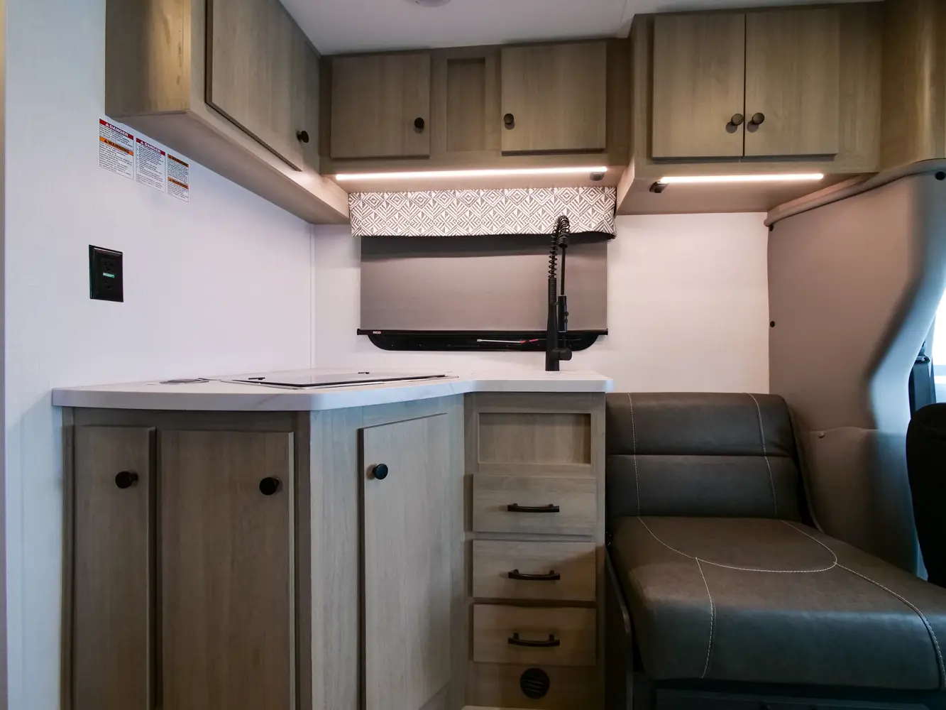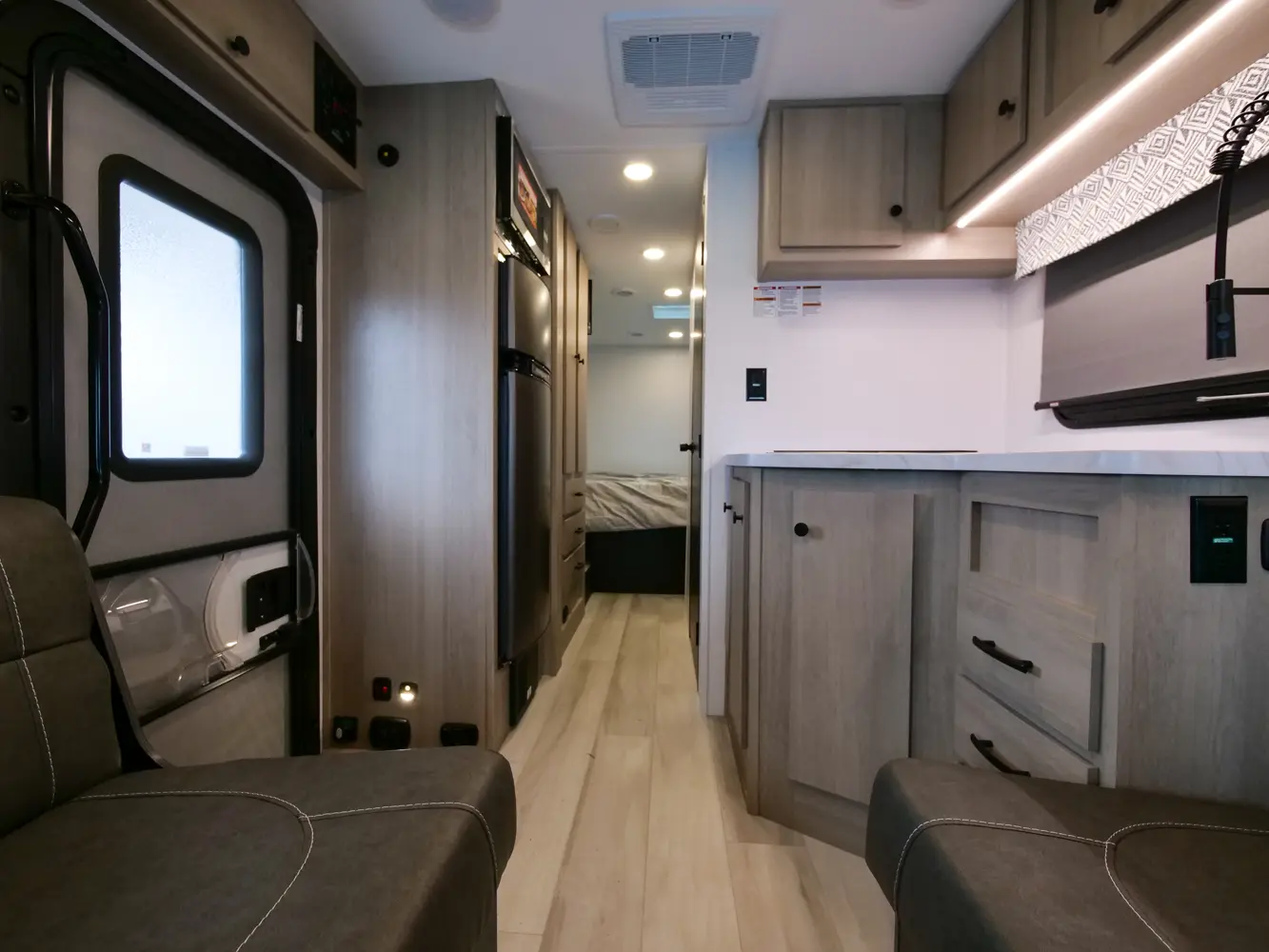 The Forester TS2381 is a great couple's coach with a 54" x 74" full bed in the bedroom and a two-person dinette with a table in between. There is a wardrobe across from the bathroom for storage. The full bathroom includes a 24" x 32" skylight shower, commode, vanity sink with extended countertop, and medicine cabinet. The kitchen offers a corner counter 12V 10 CU FT refrigerator, convection microwave, and 3-burner stovetop. Overhead cabinets throughout provide additional storage.
