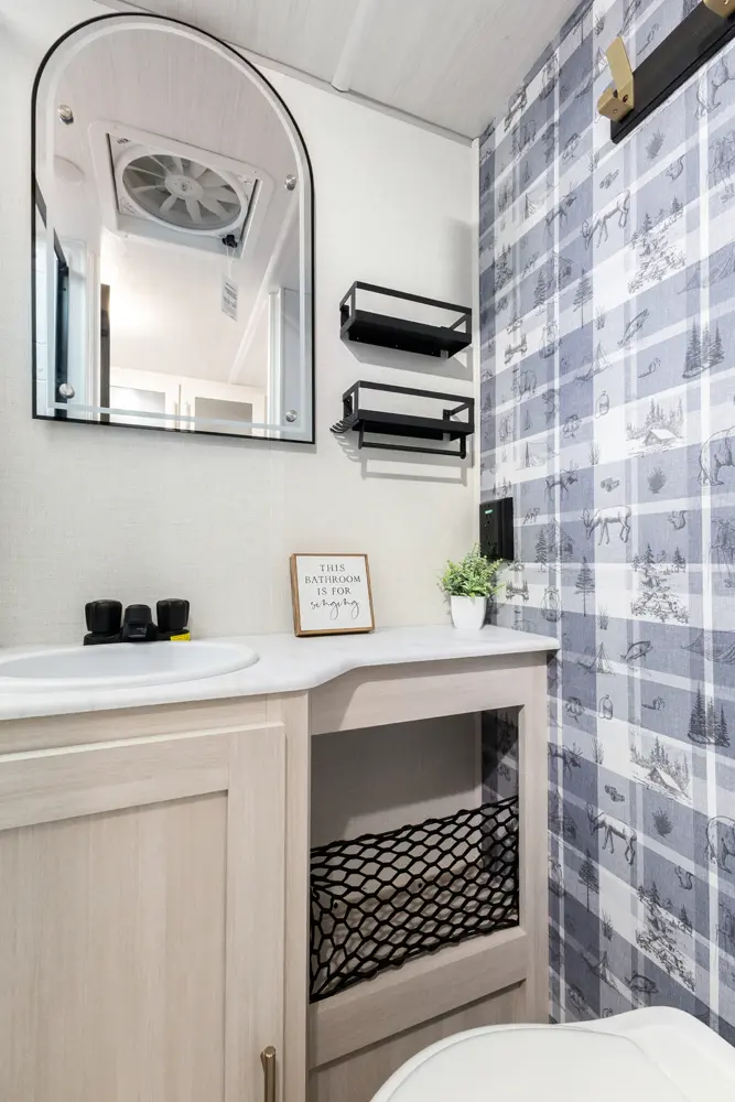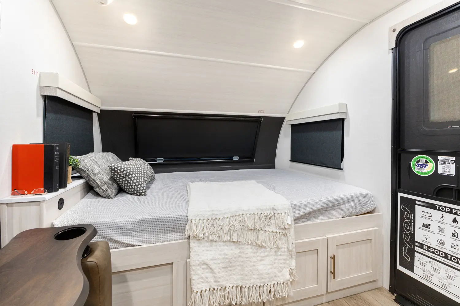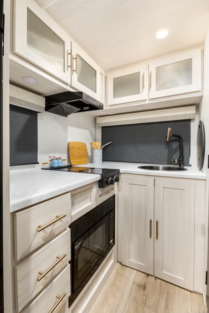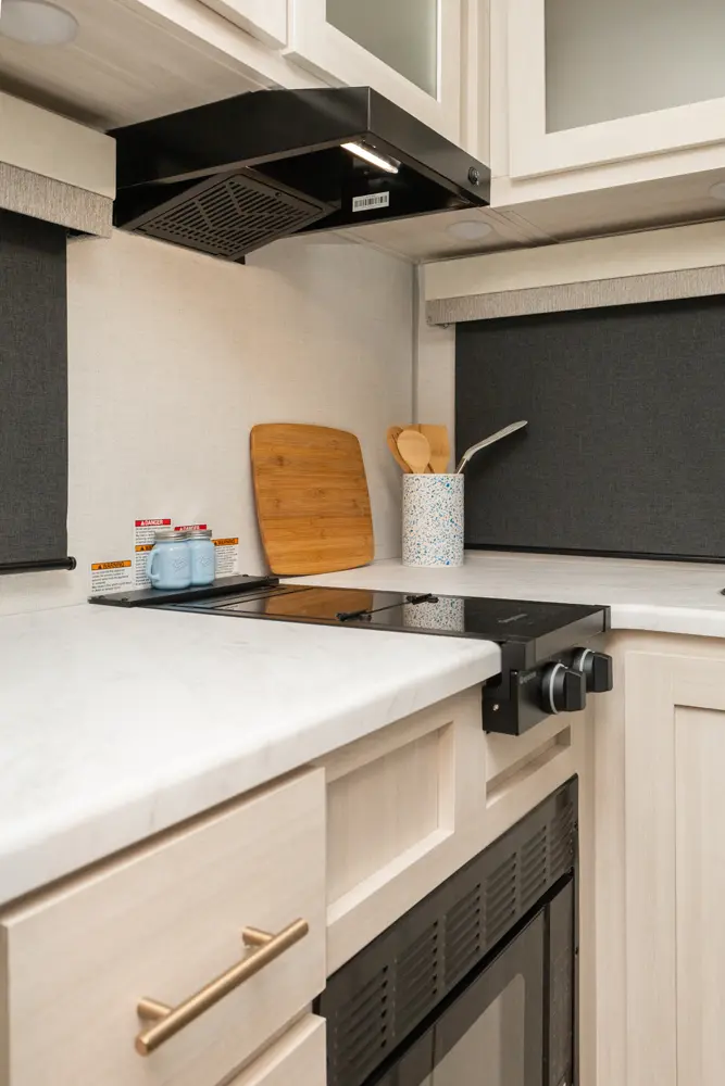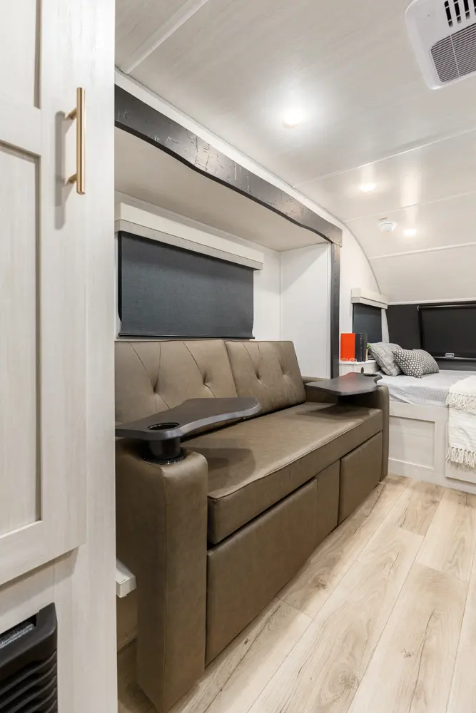 The RP-185 delivers a perfect balance of lightweight design and spacious comfort. Inside, you’ll find a roomy rear bath, well-equipped kitchen, and inviting dinette that converts for sleeping space. A unique bar top with a flip-up window creates an open-air feel, perfect for serving or relaxing outside. Modern finishes and clever storage complete this travel-ready design.