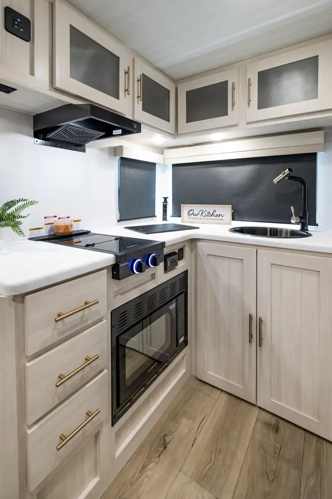 The RP-205 blends lightweight towing with a spacious layout. A private queen bedroom offers comfort and privacy, while the rear corner kitchen and booth dinette create a functional living space. The full bath adds convenience, and the theater seating enhances comfort. With modern finishes and smart storage, this no slide trailer is ideal for couples or small families seeking compact, full-featured adventures.