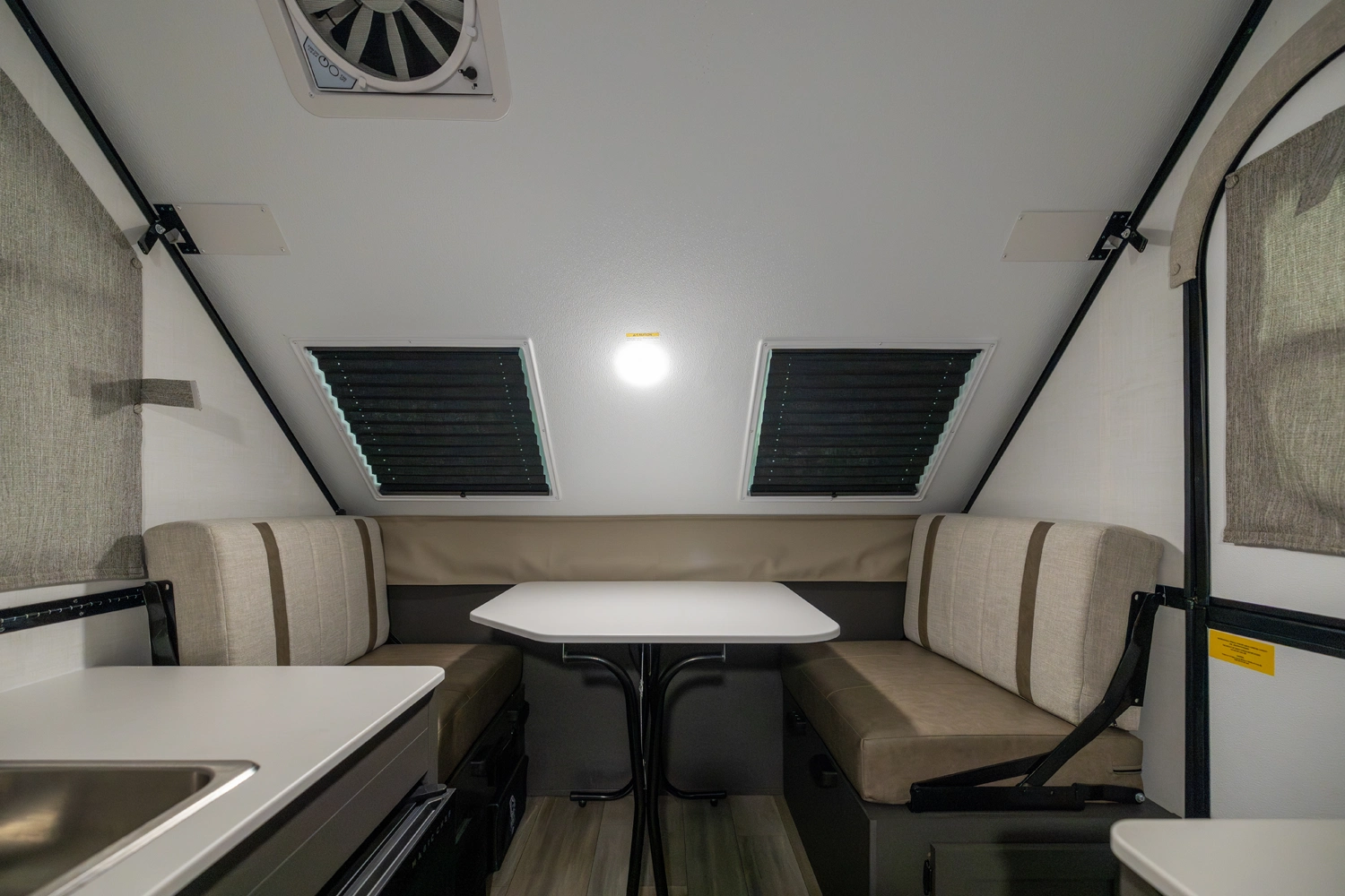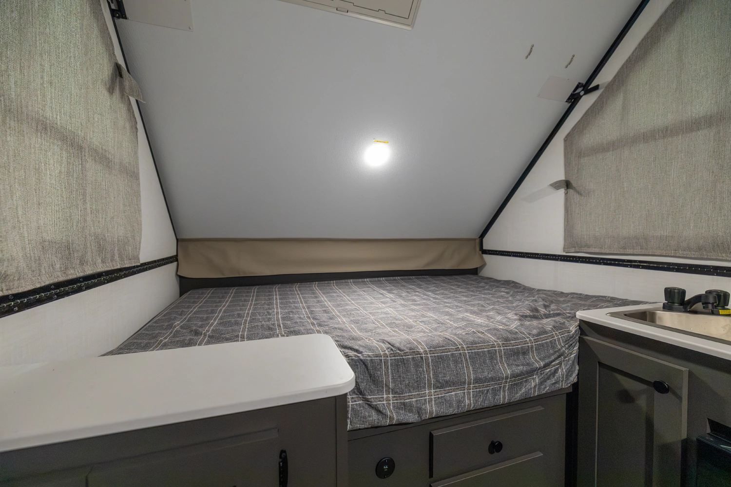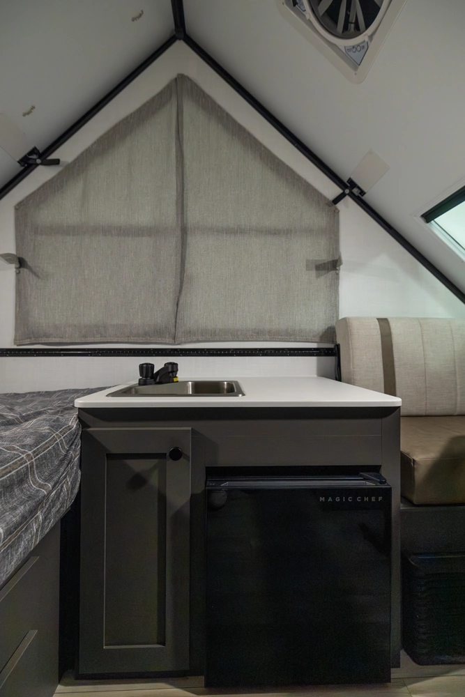 The Rockwood A101LE is a small, traditional A-frame designed for easy, compact camping. It features a rear 54" x 80" bed, a front 33" x 80" dinette, a sink, and a refrigerator in the main area, giving you all the essentials in a compact space. With its efficient layout, it’s perfect for those who want a lightweight, easy-to-tow camper without sacrificing comfort.