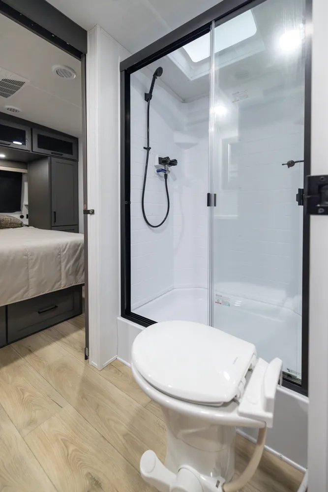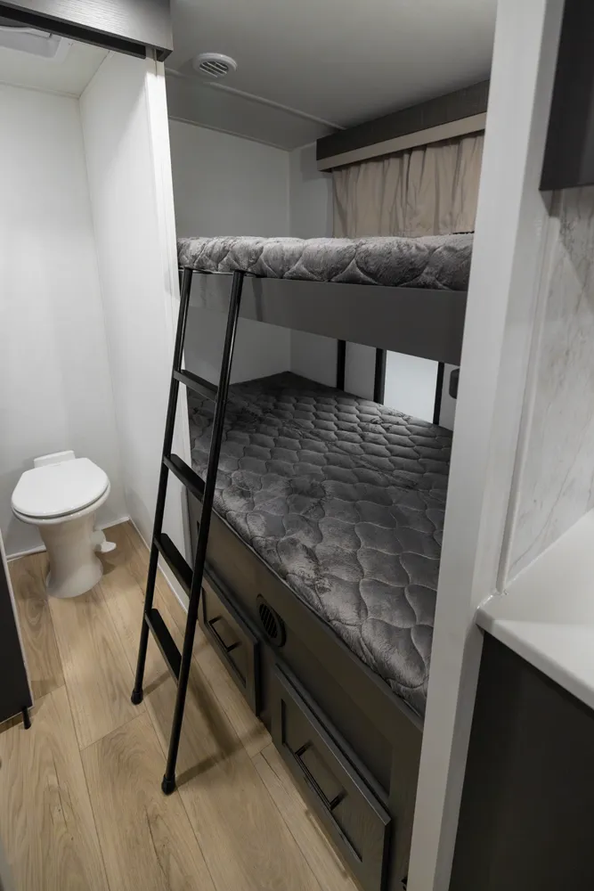 The Rockwood 2918BH features a front bedroom with a true queen bed and a large master bathroom with shower. The spacious living area and kitchen include theater seating and a dinette for comfort and dining. A rear half-bath and segregated bunk room provide privacy and convenience, making the 2918BH ideal for families seeking versatile space and comfort on the road.
