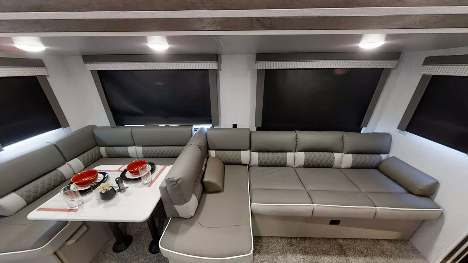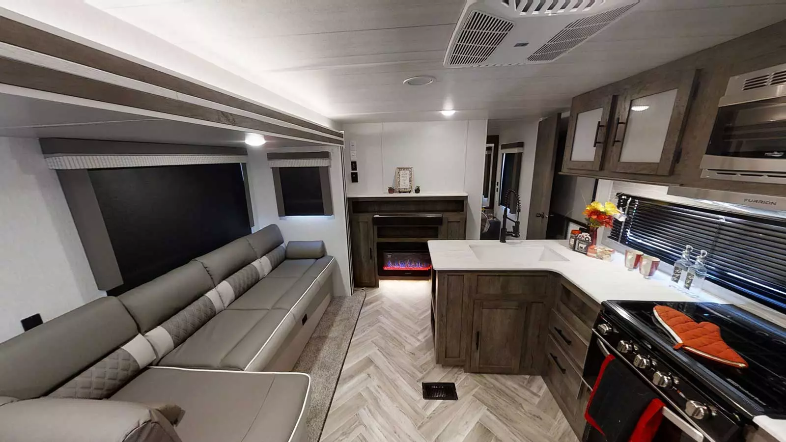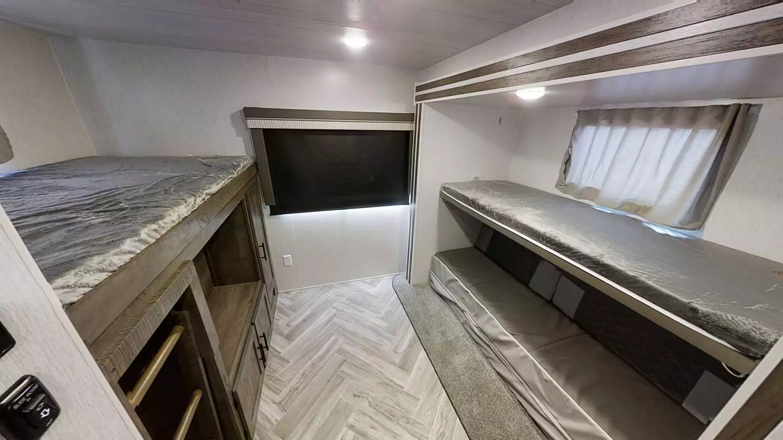 The 32BHDS has two slideouts and one entry. Exterior features include a camp kitchen and awning. Interior layout front to back: bed with shelf above and wardrobes on each side; entertainment center along inner wall; off-door side slideout with versa lounge, overhead cabinet and versa u-dinette, and wardrobe; door side entry; peninsula kitchen that wraps to door side with overhead cabinet, microwave, refrigerator, and pantry; door side full bathroom; rear bunk room with off-door side slideout with sofa option below and bunk above, and two door side bunks.