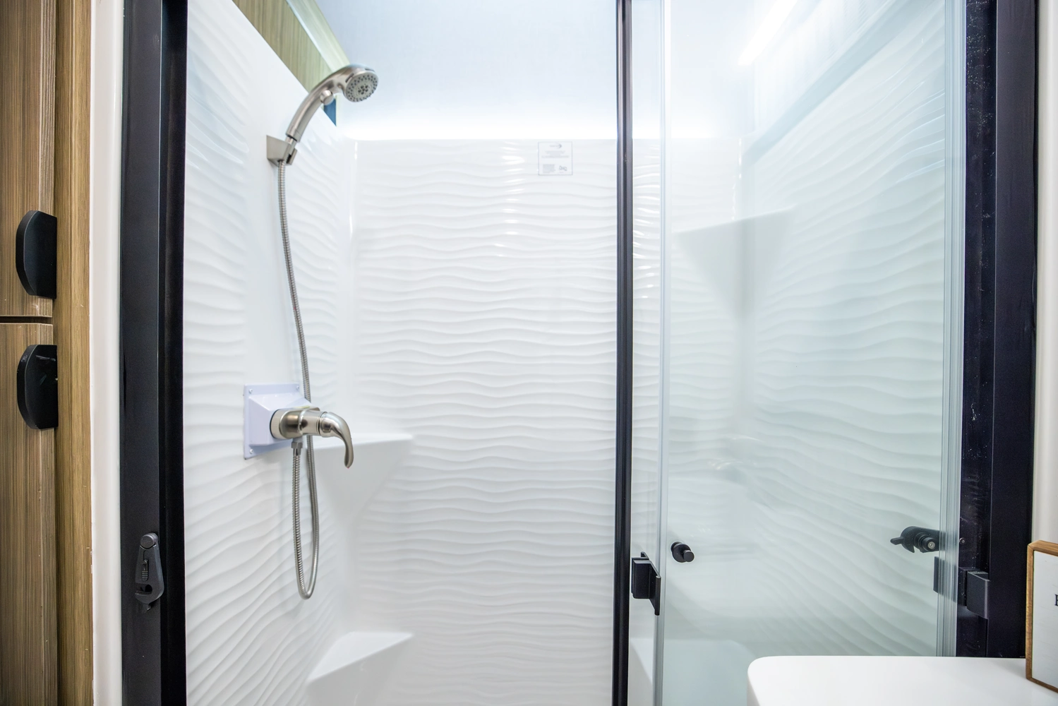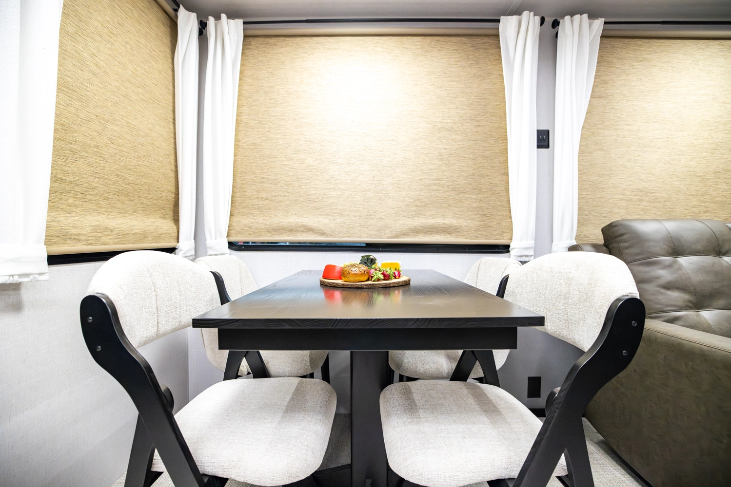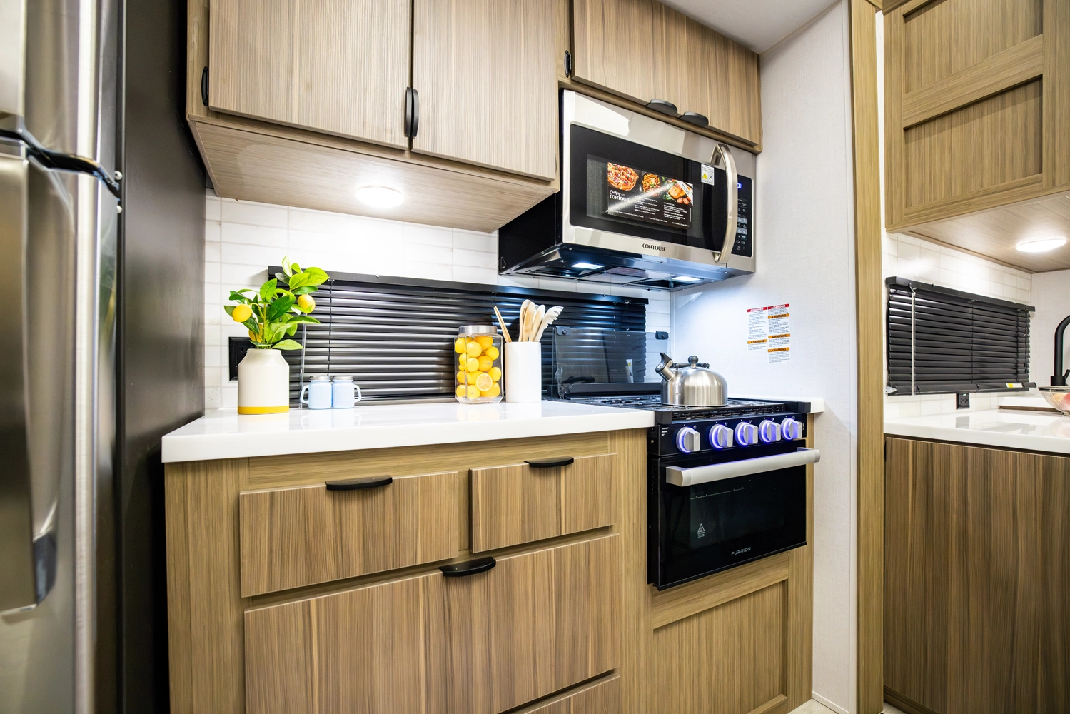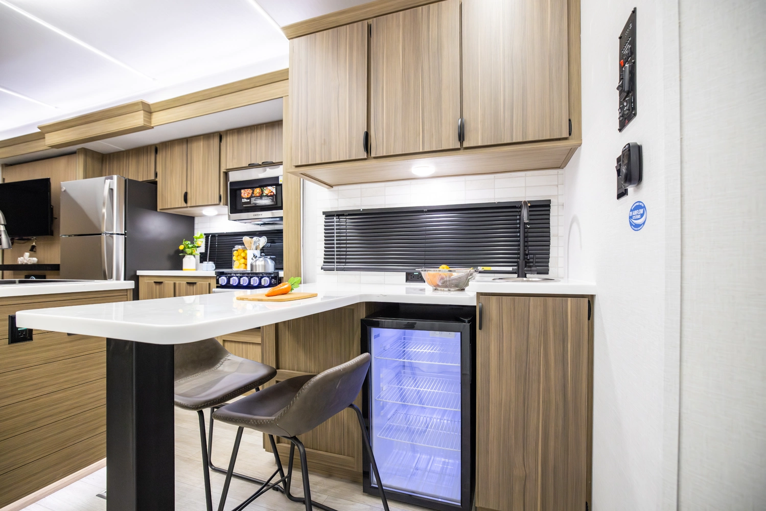 The 40RLB is an open floorplan that maximizes space for a residential cottage look and feel. The large king bedroom provides plenty of storage and washer/dryer hookup. The bathroom offers a walk-in shower with built-in seat, skylight, and linen cabinets. The island kitchen provides residential appliances and plenty of room for all the cooking essentials. Don’t forget the awesome view out the panoramic windows.