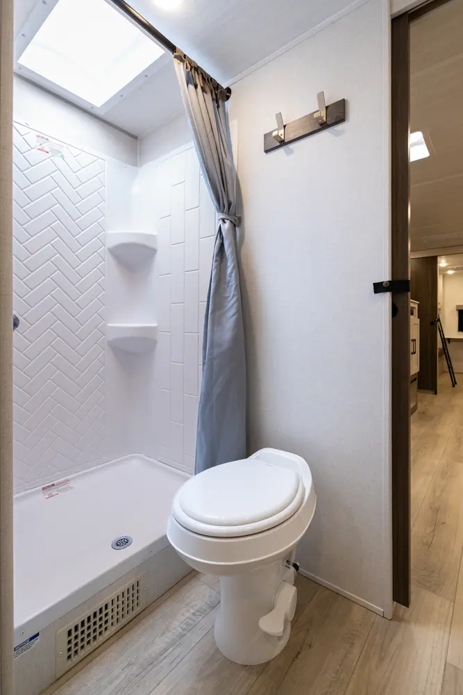 This 37' 11" travel trailer features a front private bedroom with a queen bed and ample storage. The rear private bunkhouse offers two full-size bunks and a wardrobe. The kitchen includes a 10 cu. ft. 12V refrigerator, oven, and stovetop. Living space includes a sofa and booth dinette. Exterior amenities include a 21' electric awning, outdoor camp kitchen, and a hot & cold spray port.