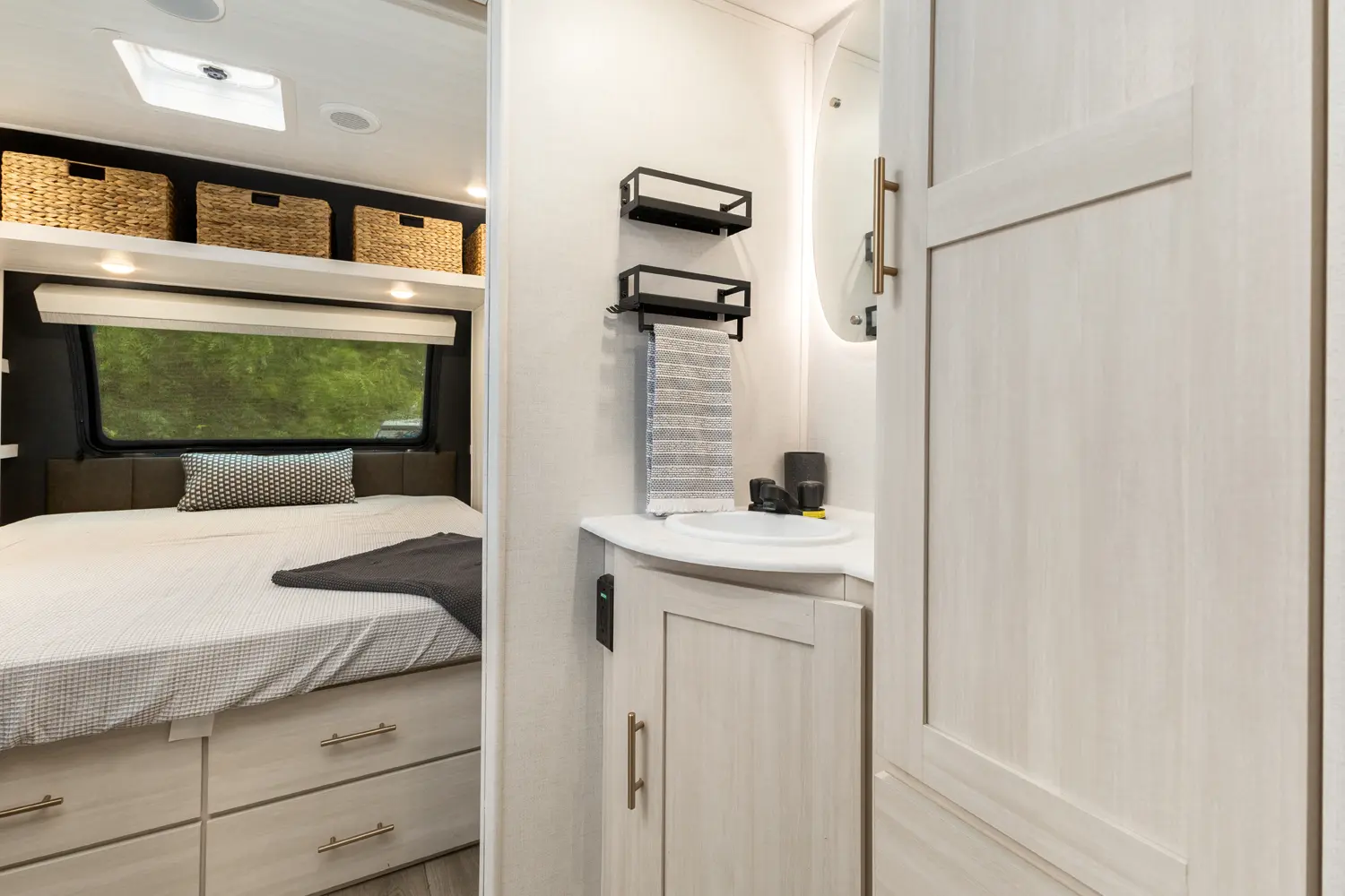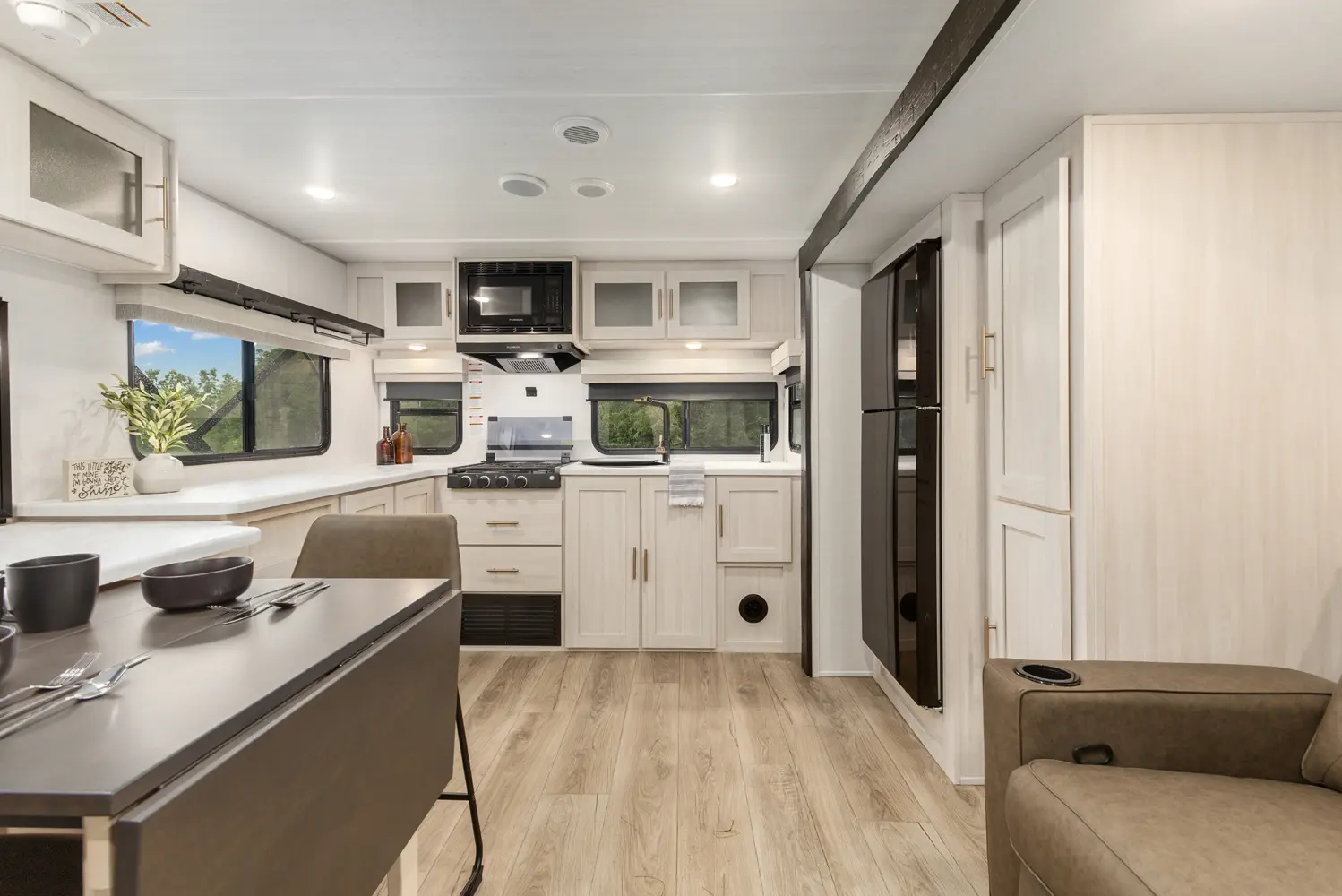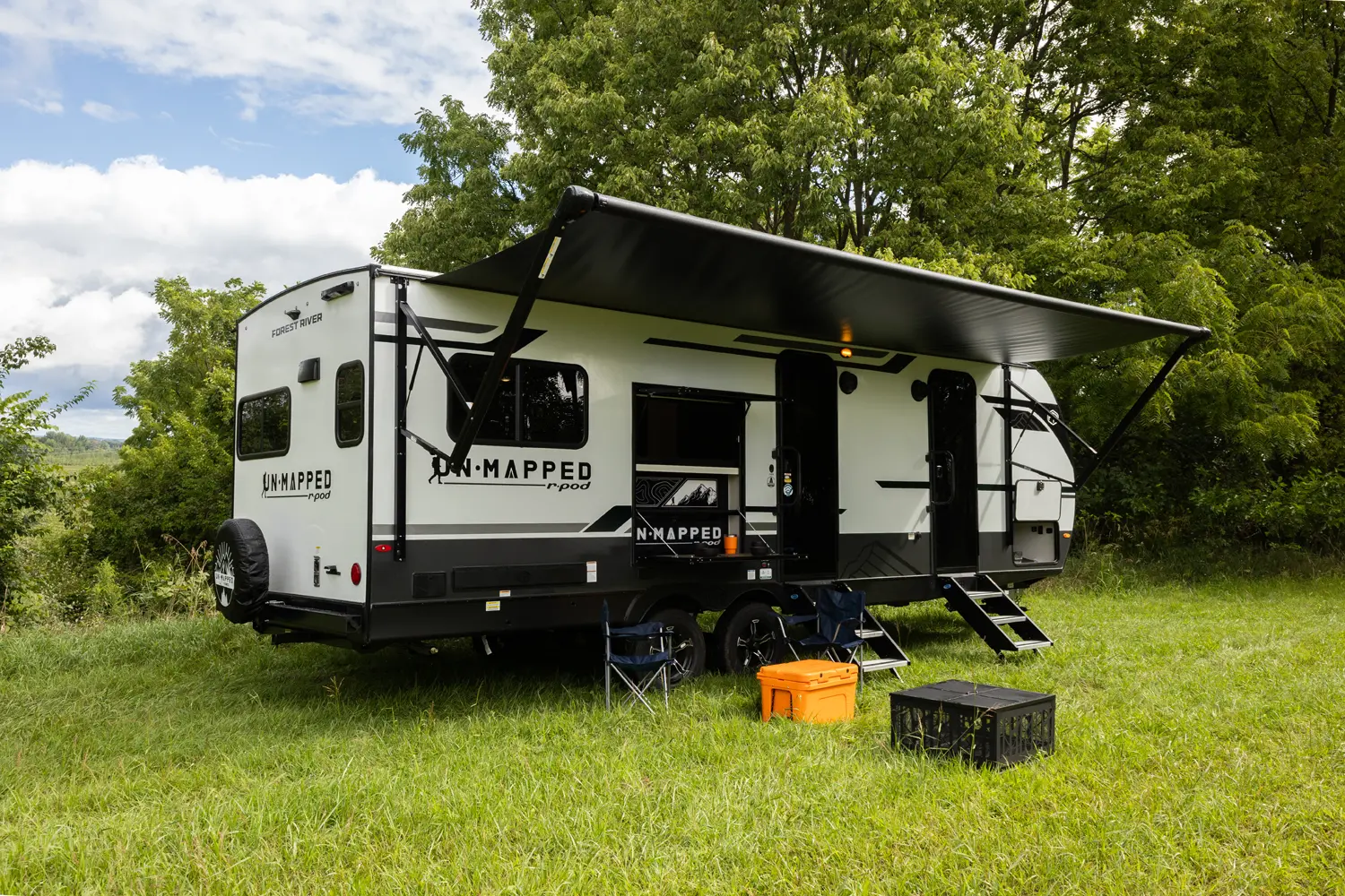 The Un•Mapped 24RK features a rear kitchen layout with a 12V black glass refrigerator, and an air fryer microwave. The Bar2Table pull-out dinette and TrailGate outdoor bar enhance dining flexibility and outdoor entertaining. Inside, enjoy a king bed, 15K A/C, and a tankless on-demand water heater. Exterior amenities include a 21' powered awning and a hot & cold spray port.